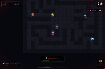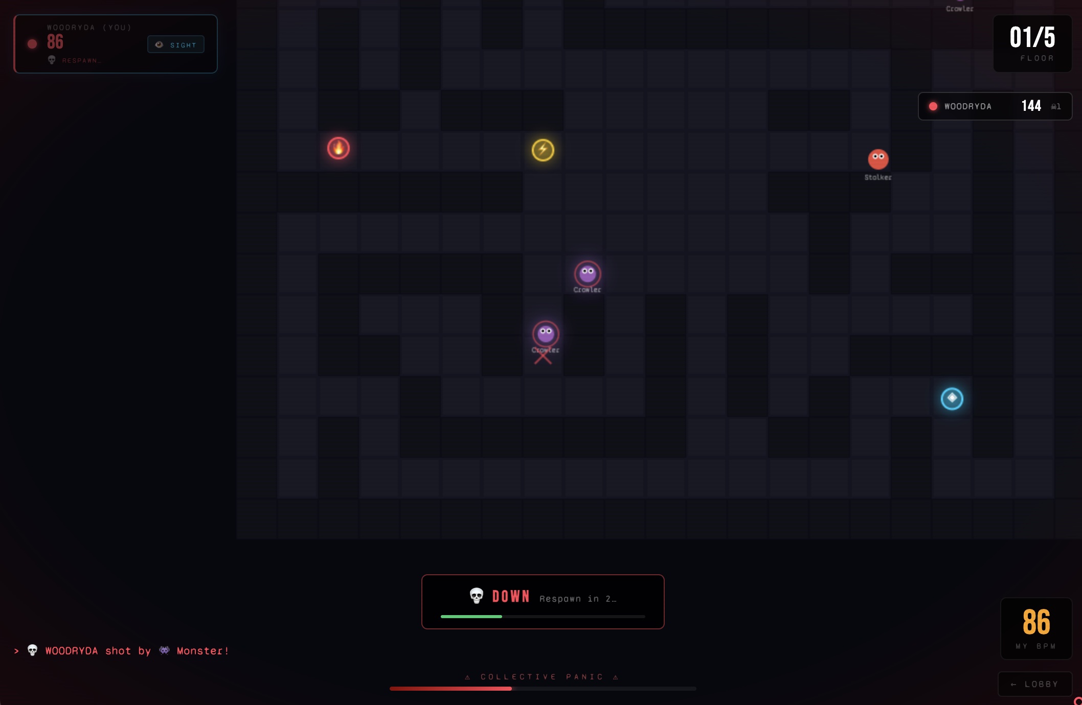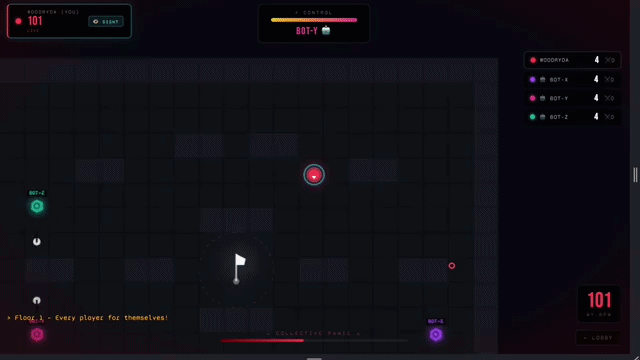 Classic last-critter-standing. Earn points by eliminating opponents and surviving monster waves. The maze reshuffles every round — no two games are the same.